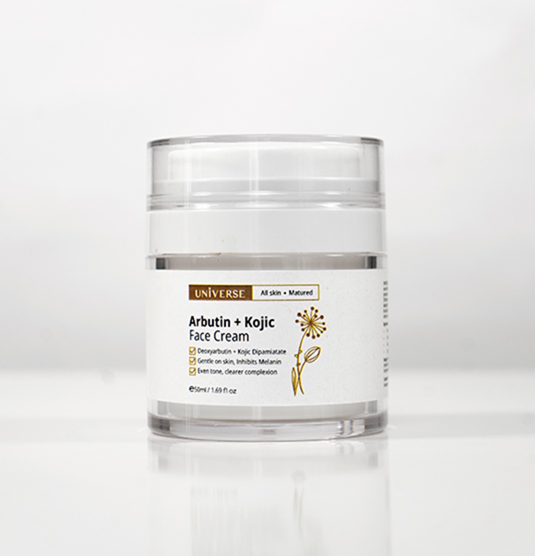 UNIVERSE Arbutin + Kojic face cream is packed with quality actives like Arbutin which is one of the most efficient skin lighteners, it uses specific enzyme transformation technology to inhibits the production of melanin for skin lightening, the type we use for this formula is Deoxyarbutin which is 350 times more effective than arbutin. It is safe, more stable, clears complexion quickly with longer lasting effect combined with Kojic Dipalmitate, which is not sensitizing like regular kojic acid to inhibit the activity of tyrosinase, an enzyme involved in reducing the appearance of hyperpigmentation and other concerns which leads to dull uneven skin.