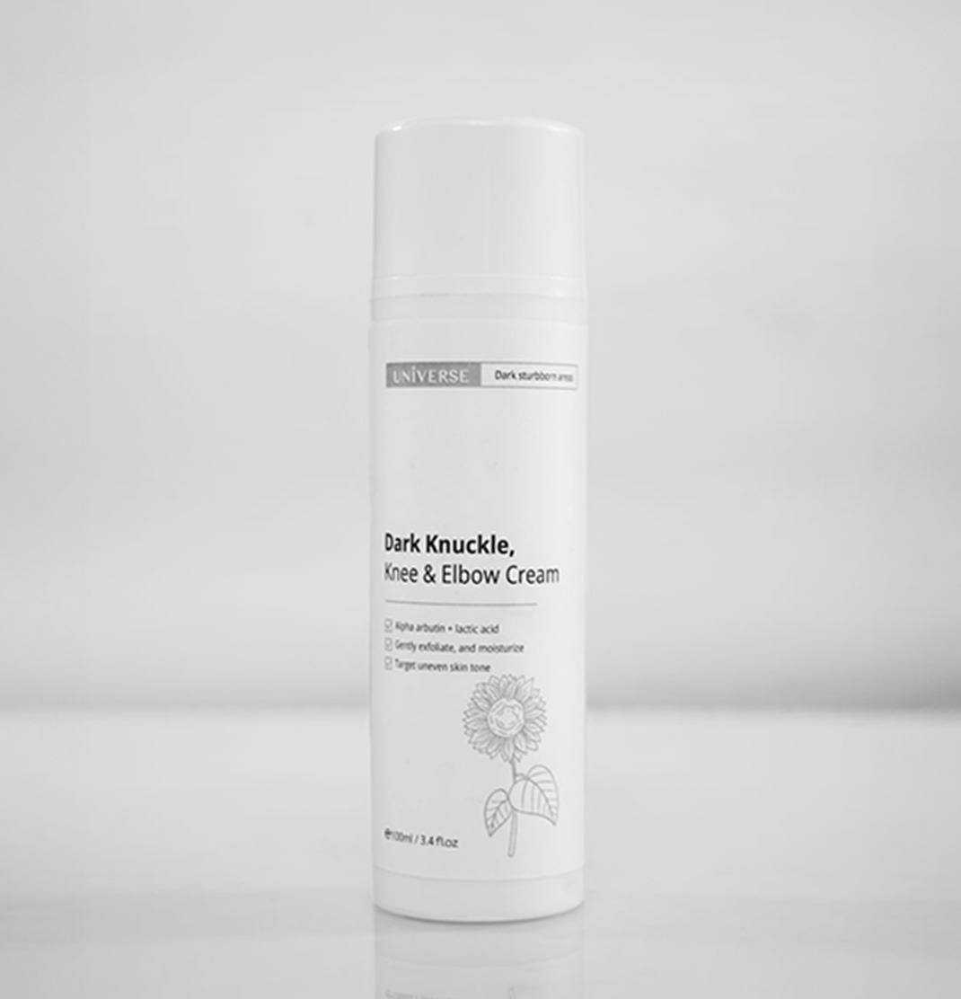 UNIVERSE Dark knuckles, knee and elbow cream is formulated with high quality Alpha arbutin which uses specific enzyme transformation technology to treat dark areas, lactic acid to exfoliate, Anti irritants and humectants to soothe and moisturize the skin. Leaving a healthy, flawless, even skin tone.