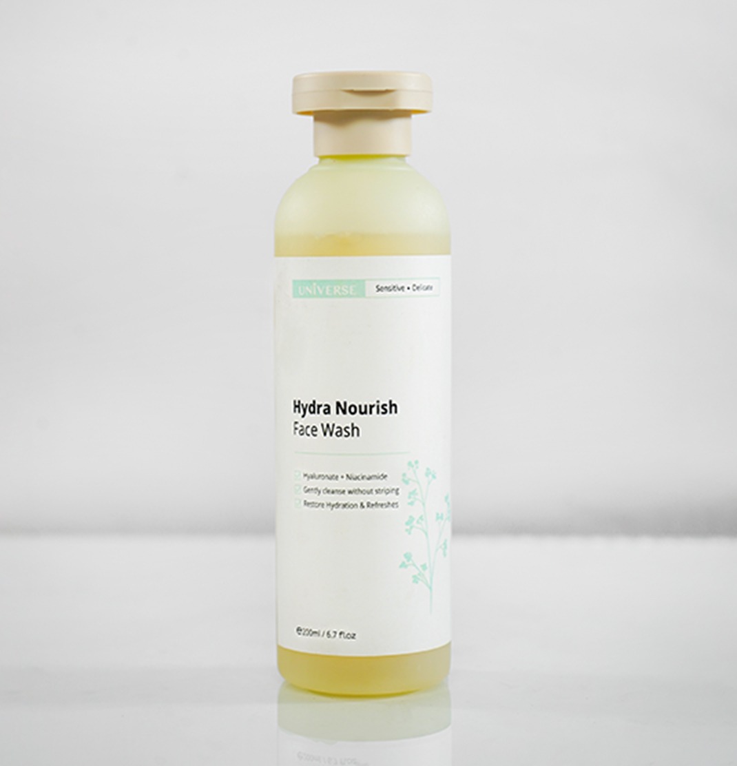 UNIVERSE Hydra nourish face wash is 100% soap free, formulated to gently cleanse without stripping skin of its natural oils, uses ingredients suitable for sensitive/ delicate skin. Leaves the skin refreshed, nourished and hydrated which enables other product to work properly.