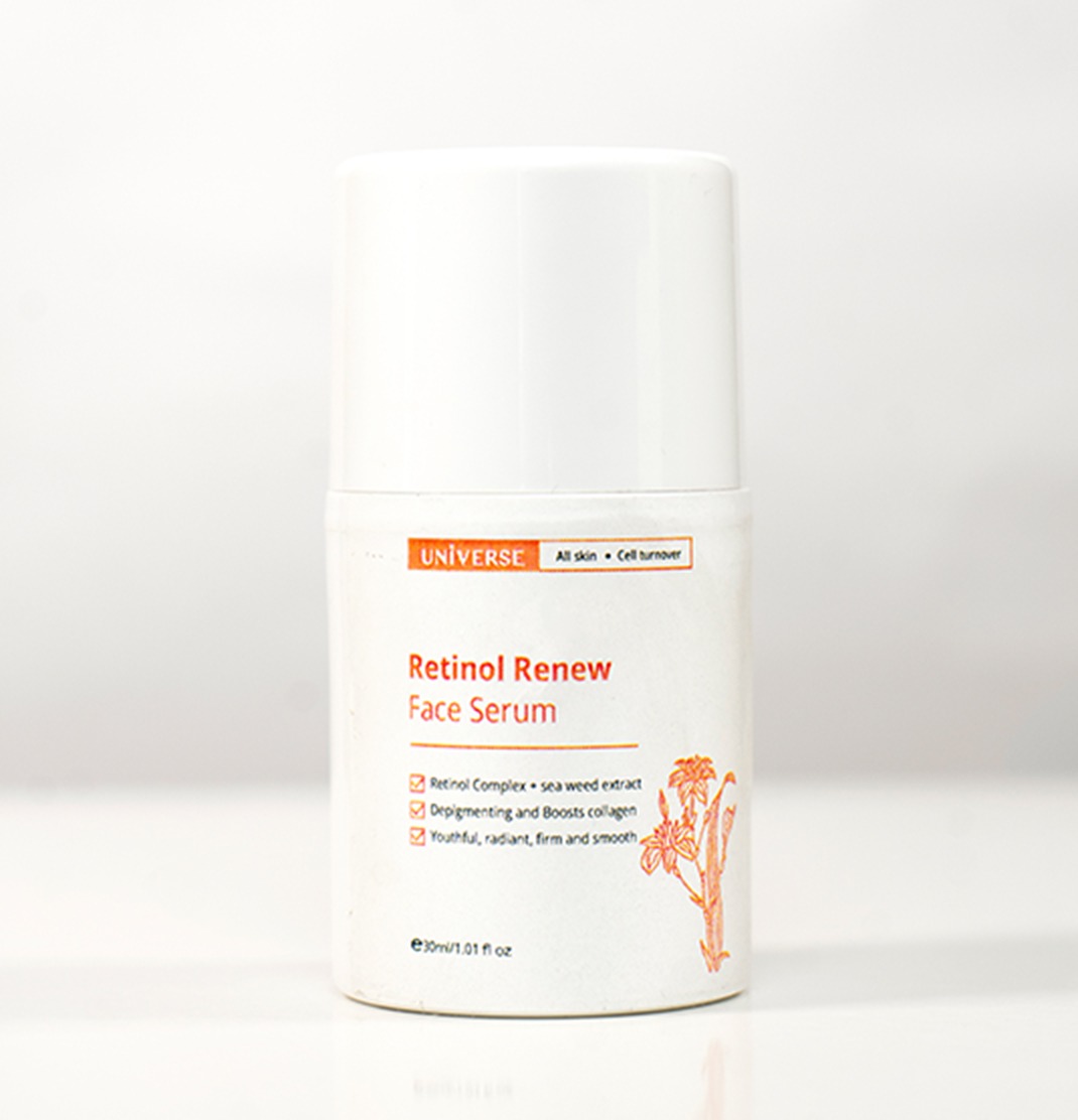 UNIVERSE Retinol renew Face serum is formulated with Retinol complex Encapsulated Retinol and Bakuchiol(Natural derivative) to effectively reduce wrinkles, fine lines, hyperpigmentation and Acne, while boosting skin hydration and prevents irritation using sea weed extract and Allantoin. Leaving the skin firm, smooth, radiant and supple.