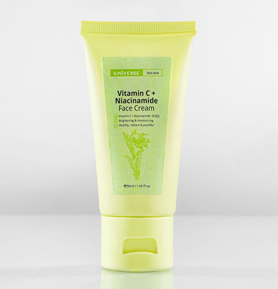 Universe Vitamin C and Niacinamide face cream is packed with natural extracts and high quality actives like Niacinamide PC (vitamin B3) to enhance skin texture by allowing it to retain its own moisture, while using a more stable form of vitamin C, Ascorbyl Tetraisopalmitate with enhanced penetration to brighten, fight free radicals and external stressors which can lead to dull, uneven skin tone, age spots and other early signs of aging.